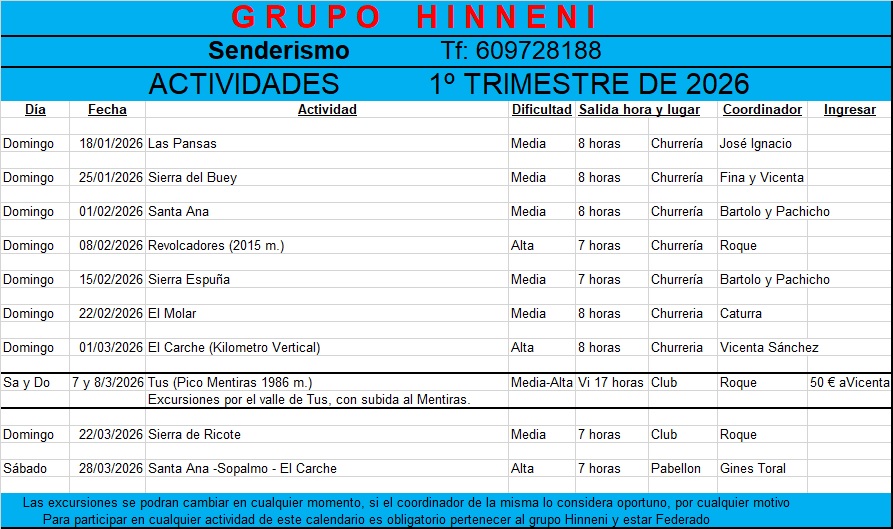 Senderismo, calendario del 1er trimestre del año 2026.enero 13, 2026 Ya está publicado en la Sección de Senderismo de esta página web el calendario del primer trimestre de este año 2026. Os deseamos a todos un buen año de actividades.